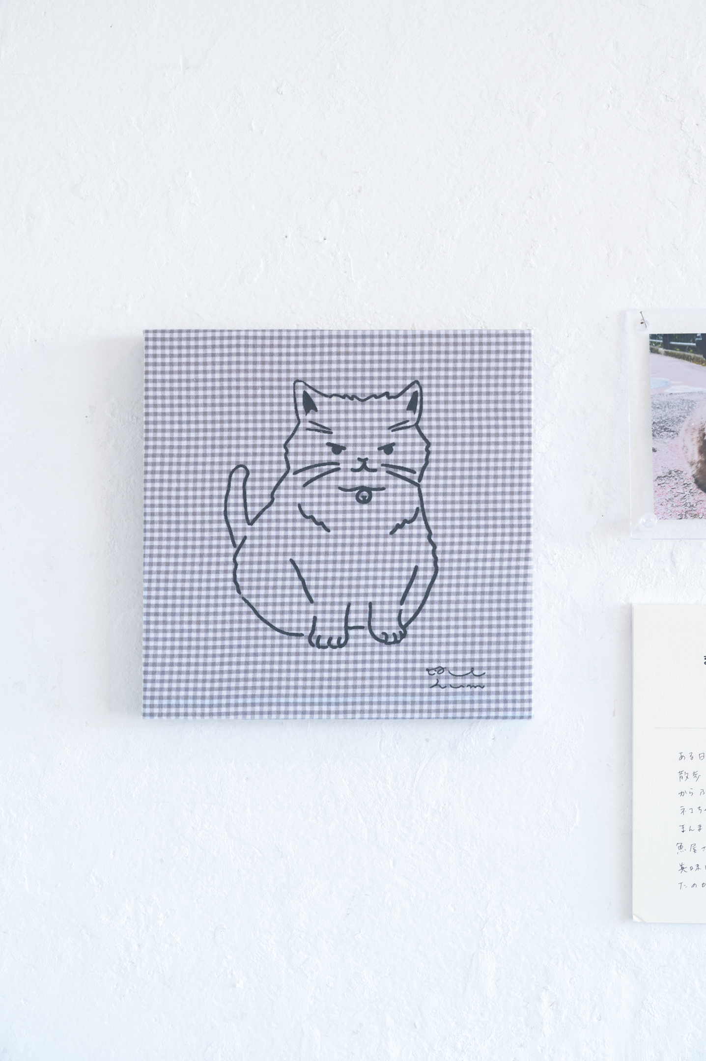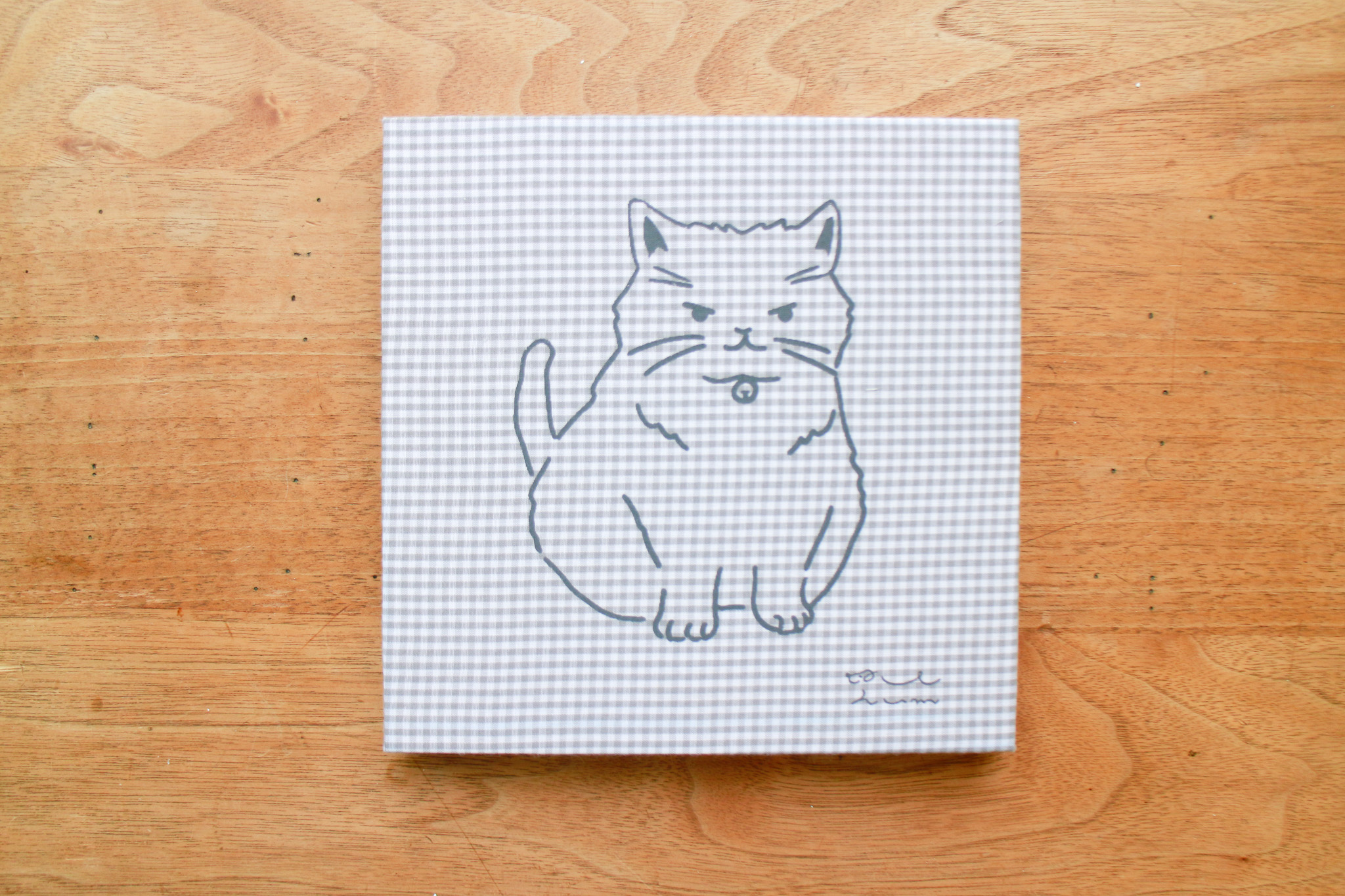 実家にふらっとやってきて、飼い主が見つからずそのままうちの子になったトラネコのナゴ。猫のくせに名前を呼ぶとにゃおにゃお言いながら寄ってきた。まるまる太って大きくて、気ままだった。お母さんの布団をふみふみしながらゴロゴロ言っていた。とてもかわいかった。犬派でしたが、ナゴのおかげで猫のことが大好きになりました。2024年に天国へ旅立ちましたが、愛おしかったナゴのこと、いつまでも忘れないように制作しました。