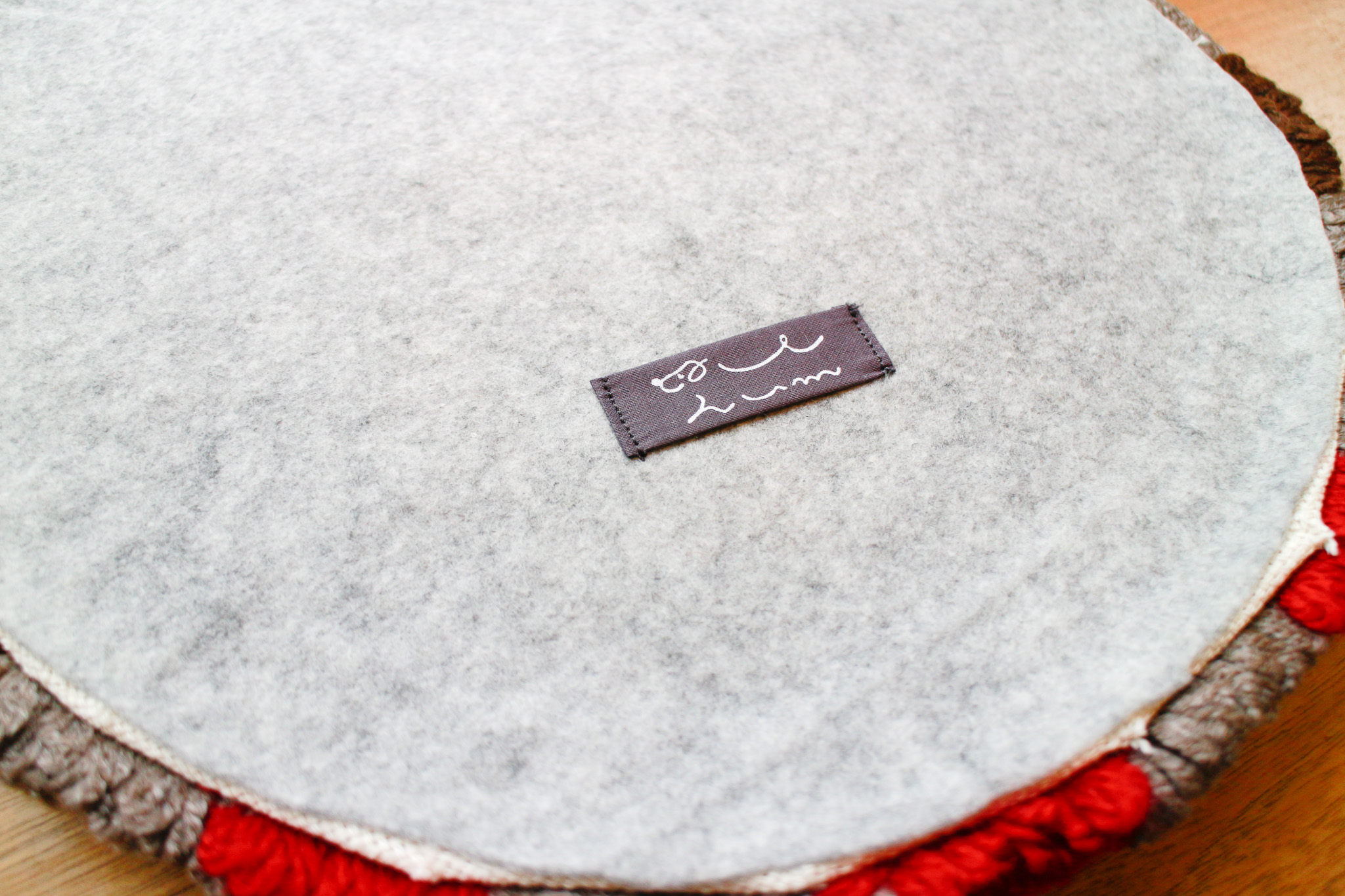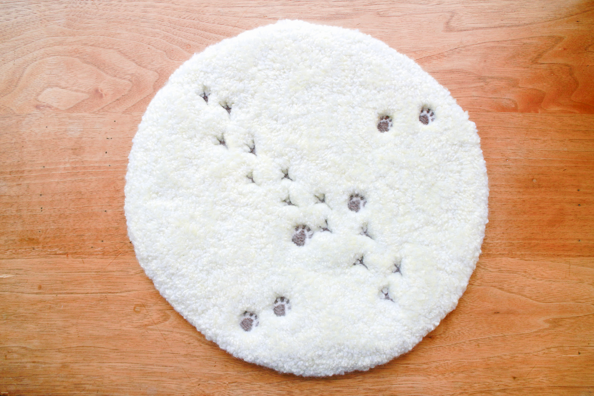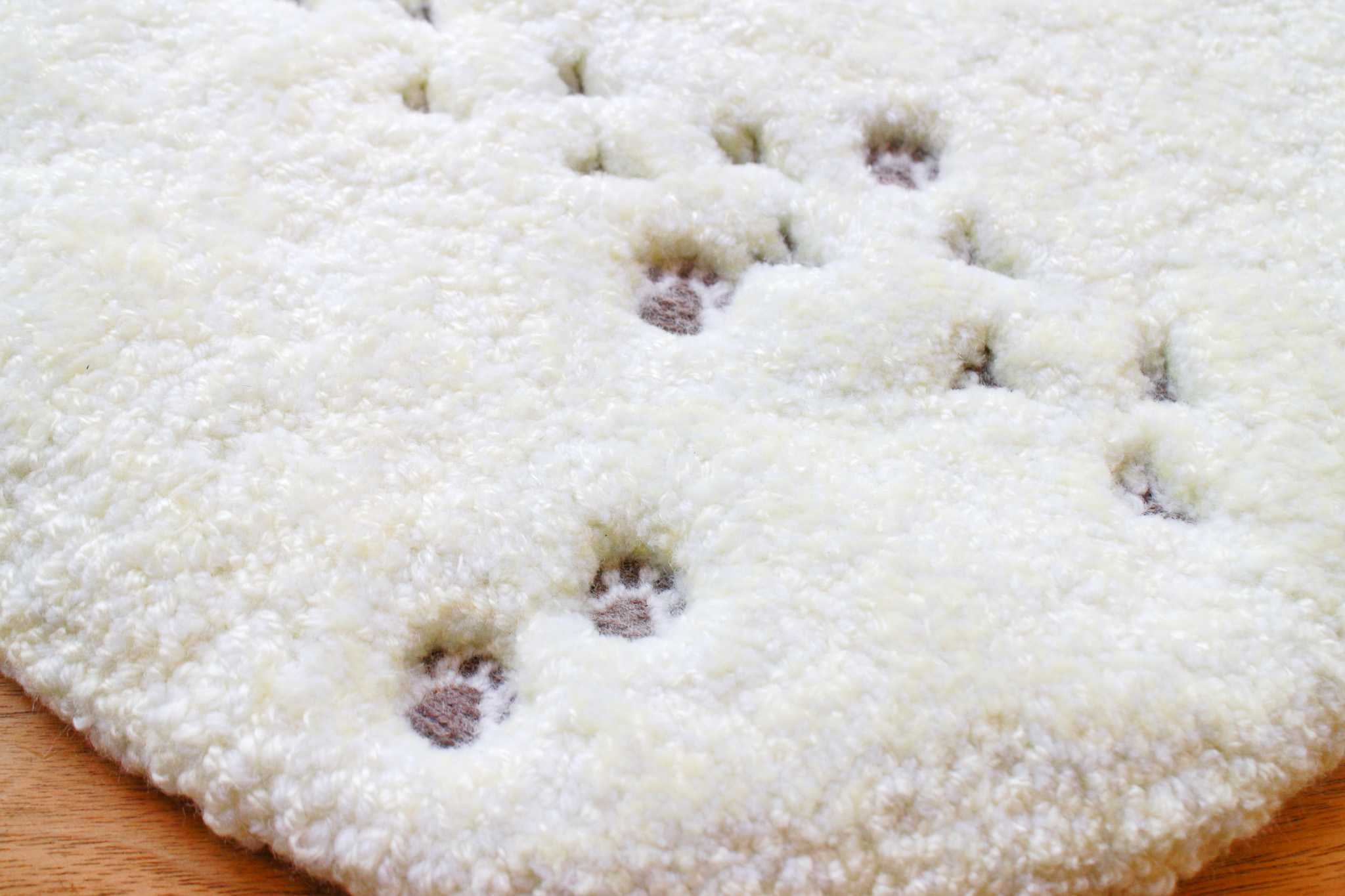 雪の日の朝、まだ誰も歩いていない雪の上を歩くのが好きです。そんな日には、私より早起きの散歩の犬の足跡とか、小鳥の足跡を見かけることがあります。そんな小さな足跡が残る雪の上をイメージして、こんなマットがあったらかわいいかな〜と思って制作しました。
