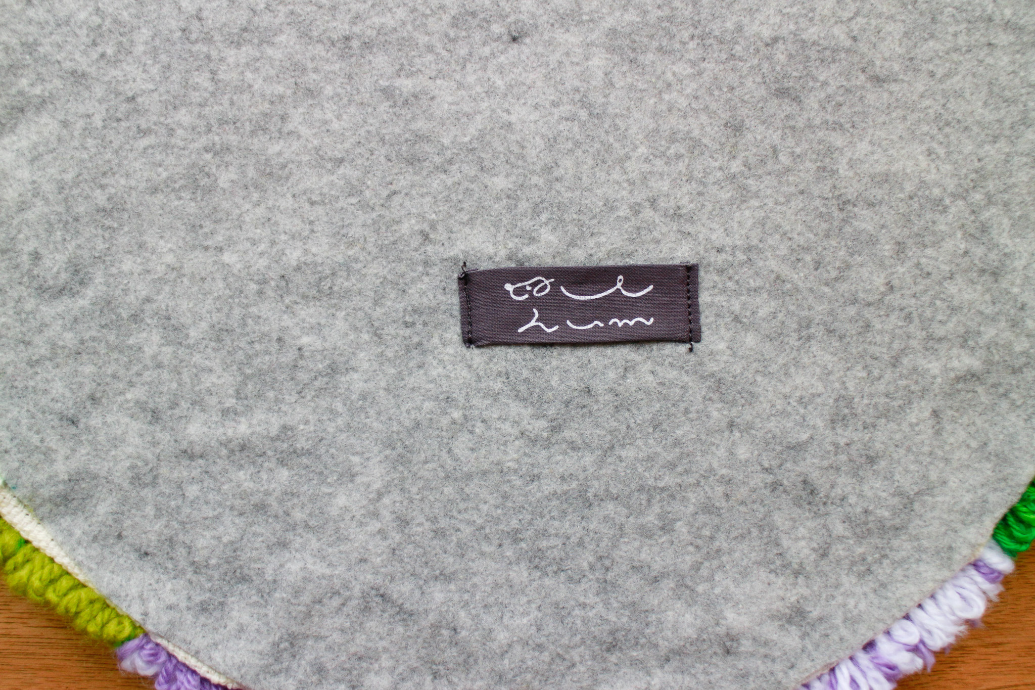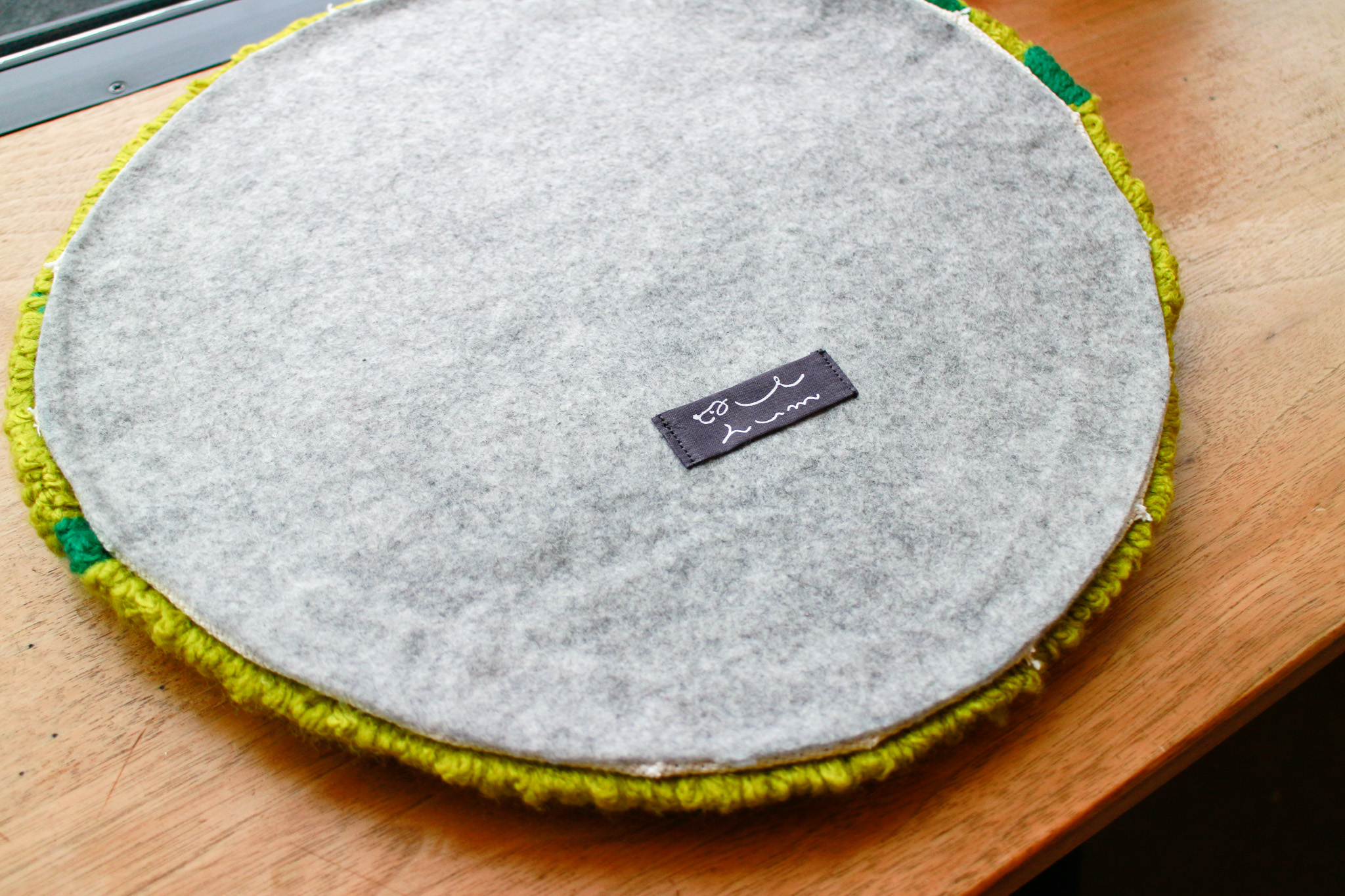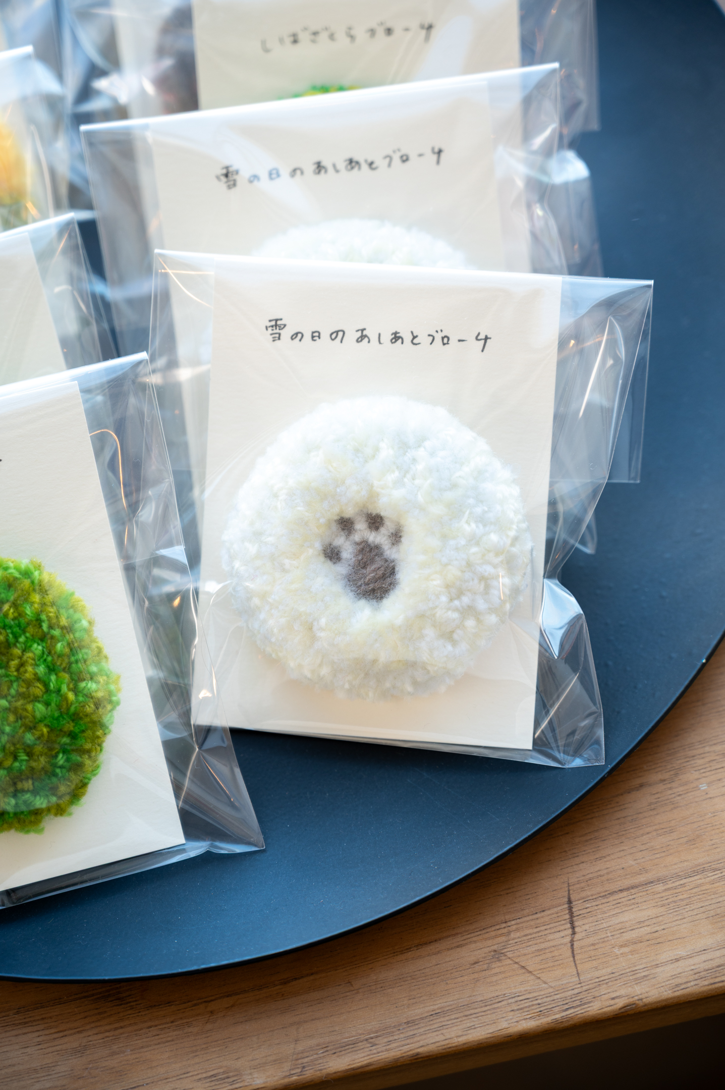 雪の日の朝、まだ誰も歩いていない雪の上を歩くのが好きです。そんな日には、私より早起きの散歩の犬の足跡とか、小鳥の足跡を見かけることがあります。そんな小さな足跡が残る雪の上をイメージして、こんなマットがあったらかわいいかな〜と思って制作しました。